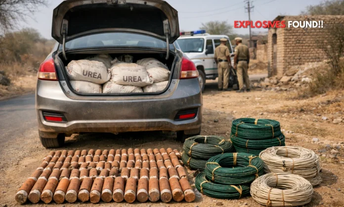 A dramatic interception in Rajasthan’s Tonk district on Wednesday exposed a major ammonium nitrate seizure Tonk event, raising alarms just hours before New Year’s Eve celebrations. Police, acting on precise intelligence, stopped a Maruti Ciaz car in the Baroni police station area and uncovered 150 kg of illegal ammonium nitrate concealed inside bags labeled as urea fertilizer. The vehicle also carried around 200 explosive cartridges and six bundles of safety fuse wire totaling approximately 1,100 meters, materials potent enough to fuel significant blasts if misused.