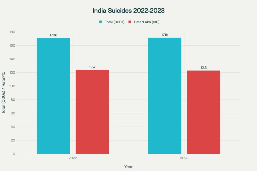 • India recorded over 1.71 lakh suicides in 2023, signalling a growing mental-health burden that affects individuals across income levels, professions, and social strata.