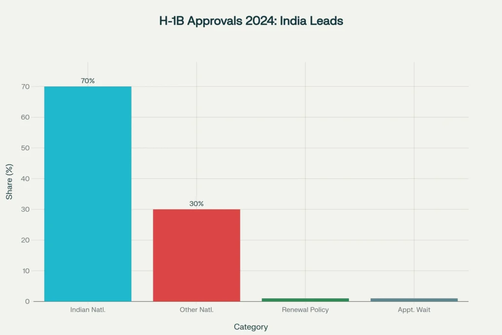 • Indian nationals made up about 70% of H-1B approvals in 2024, central to discussions around the Trump H-1B Visa Stance: Balancing Skilled Immigration with American Jobs.