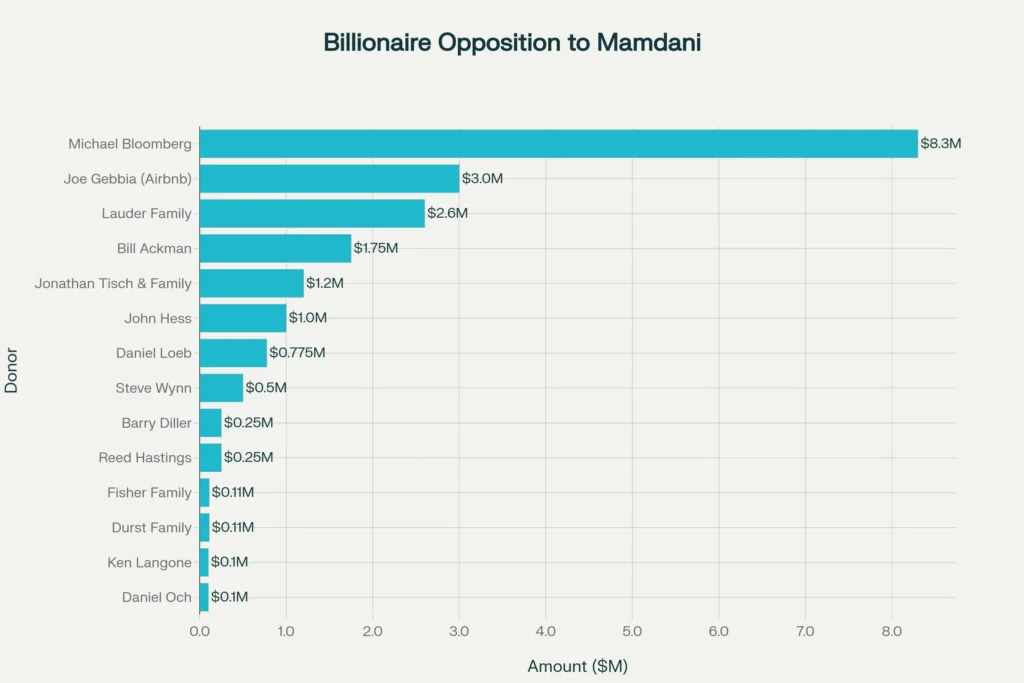 • At least 26 billionaires including Michael Bloomberg, Bill Ackman, and Joe Gebbia collectively funded campaigns to prevent Mamdani’s election